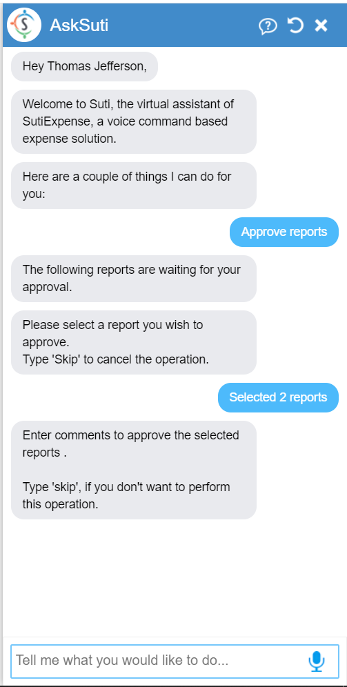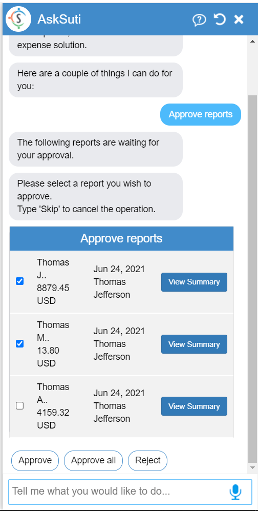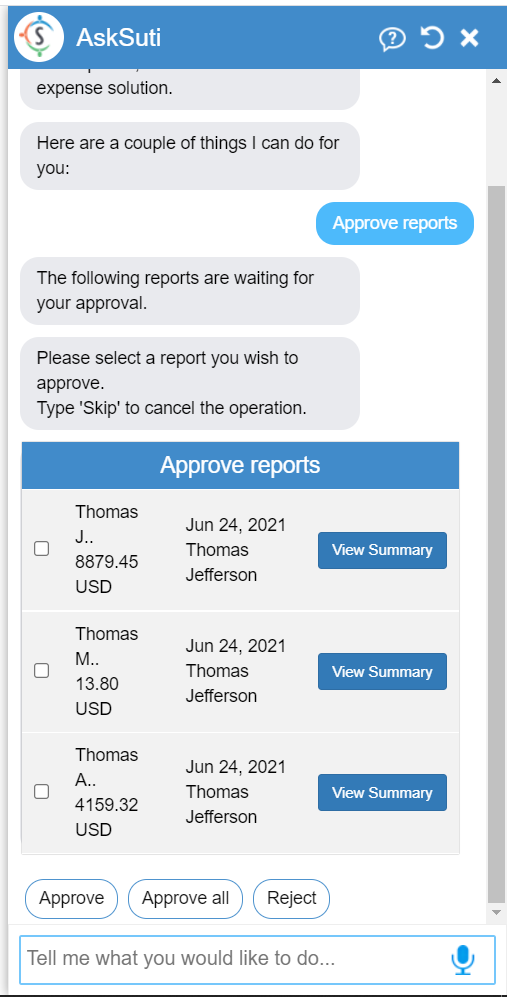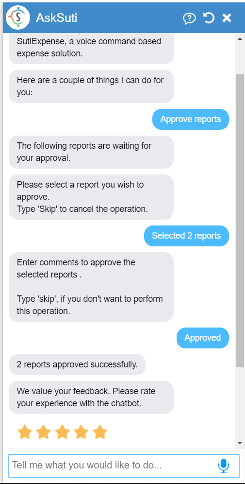 right from the chatbot by simply asking ‘Approve a report’.
